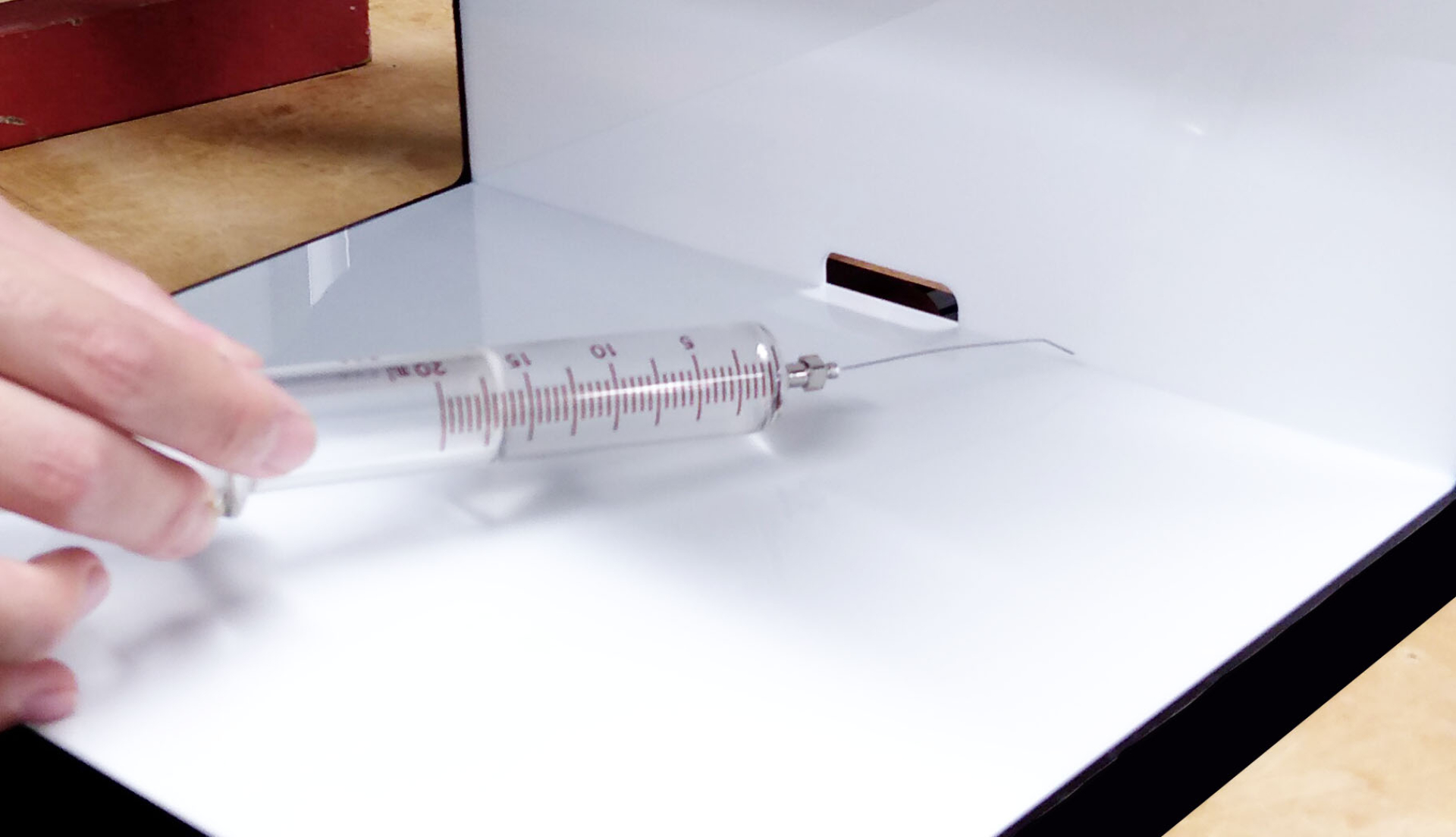 板と板の間に専用の注射器を使い、溶剤を流していきます。